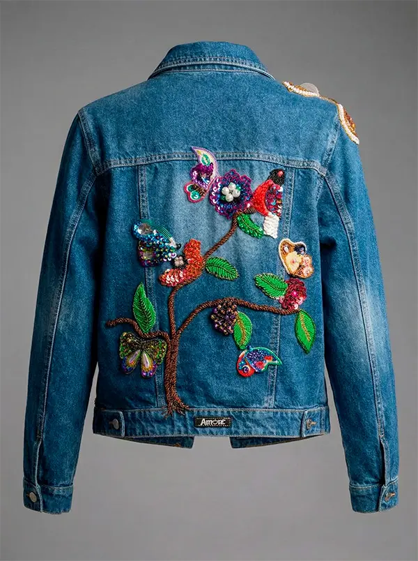 A classic fit jacket crafted from rigid denim. The garment showcases a hand-crafted artistic intervention spanning the front and sleeves, characterized by textured organic motifs. Notable details include interlaced cordwork mimicking vines, alongside multicolored beaded appliqués forming hummingbirds and butterflies. Each piece is individually worked in the Marianela Isashi atelier, ensuring a unique and textured finish.